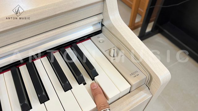 - Test phím: Hãy vặn volume về mức 0, dùng tay gõ thử toàn bộ 88 phím từ trái sang phải xem có phát ra tiếng cọc cạch của nhựa hay bị kẹt rít do khô dầu không.