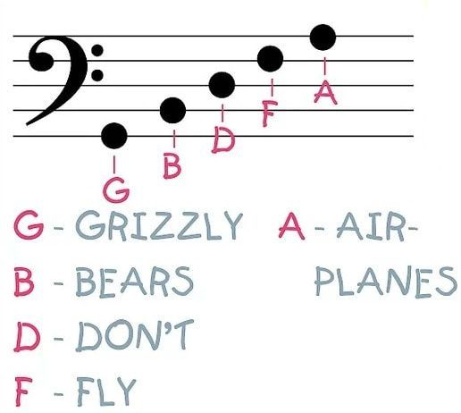 - Các nốt trên dòng kẻ: Bạn có thể nhớ các nốt trên dòng bằng câu thần chú “Brizzly Bears Don’t Fly Air” (Sol, Si, Re, Fa, La) từ dưới lên.