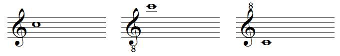 Những số này cũng có thể được đặt trên khóa nhạc để biểu thị các nốt cao hơn 1 hoặc 2 quãng tám. Khóa Sol với số tám bên dưới là loại phổ biến nhất, thường dùng trong nhạc cho guitar hoặc giọng nam cao. Đôi khi, sự dịch chuyển một quãng tám lên sẽ được biểu thị bằng cách vẽ hai khóa thay vì một.